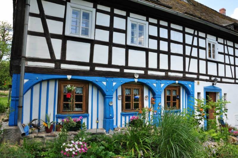 wyremontowany dom przysłupowy, wybudowany około 1825 roku usytuowany w 'Artystycznej' wsi Wolimierz u podnóża Gór Izerskich.